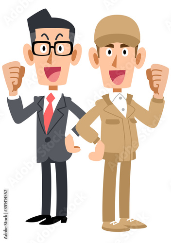 背中合わせでガッツポーズするスーツを着た男性とベージュ色の作業着の男性