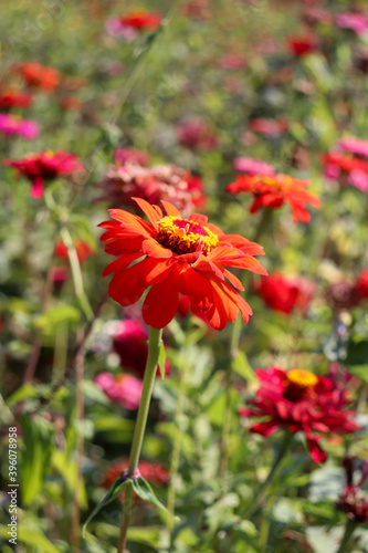 花 花畑 秋 赤い オレンジ ジニア 大輪