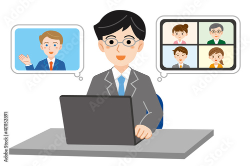 ノートパソコンでオンライン作業をするスーツ姿のメガネをかけた男性のイラスト/白背景