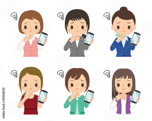 悩み顔でスマホを持つ女性 イラスト