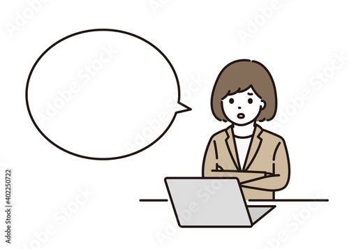 パソコンの前で腕組みをするビジネスウーマン 吹き出し