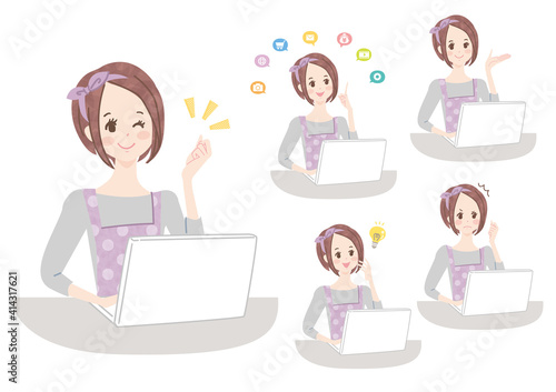 パソコンで作業する若い女性の表情セット