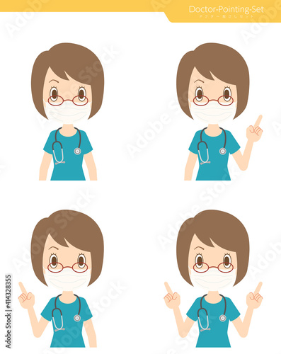 指差しをするマスクを付けた女性医師 セット