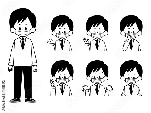マスクをしている男子学生の表情セット-白黒