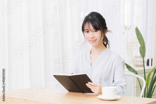 部屋でノートにメモを書く若い女性