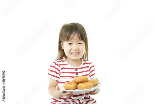 おやつのドーナツを持っている笑顔の女の子