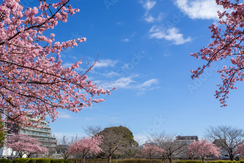 埼玉県さいたま市の東浦和にある井沼方公園の満開の河津桜と風景
