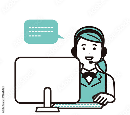 パソコンに向かうコールセンター、オペレーターの女性 話す