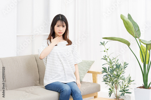 喉に手を当てる体調不良の若い女性