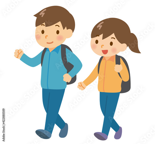 ハイキングで歩く笑顔のカップル