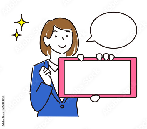 スマホの画面を見せている スーツ姿の女子 笑顔 程よいシンプルな女性のイラスト ベクター