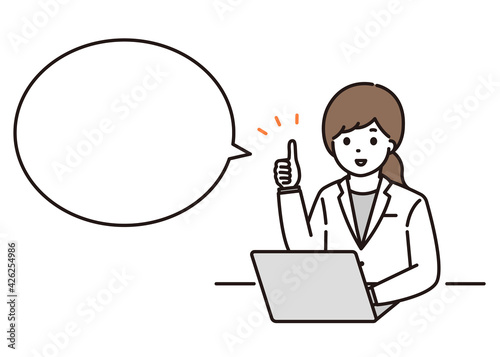 パソコンの前でグッドサインをする女性薬剤師 吹き出し