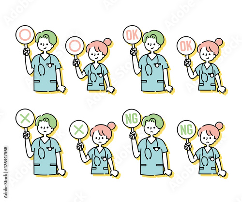 スクラブを着た看護師が◯×パネルを挙げているイラスト(上半身)