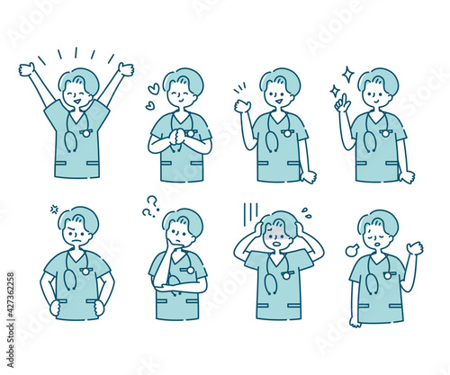 スクラブを着た男性看護師の感情表現イラスト(上半身)