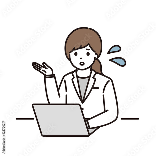 困った顔でノートパソコンの前で説明をする女性薬剤師