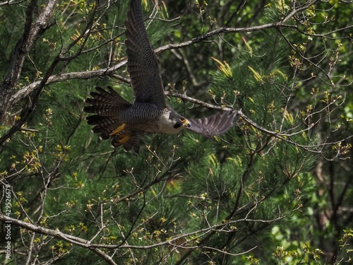 グリーンバックに忙しく飛び回る繁殖期のハヤブサ成鳥オス