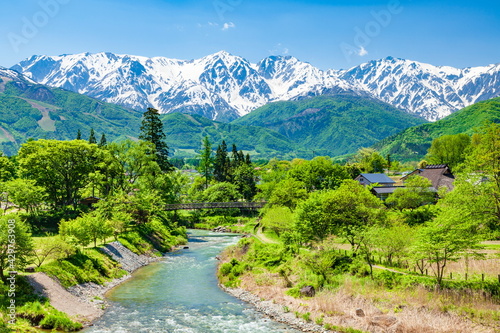 大出吊り橋と白馬三山 長野県北安曇郡白馬村大出公園にて