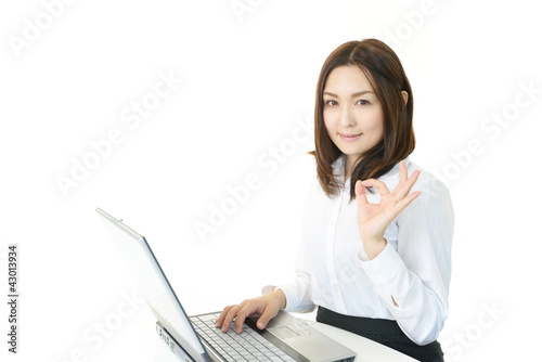 パソコンに向かいOKサインを出すオフィスレディー