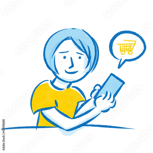 スマートフォンでネットショッピングをしている女性の手描きイラスト