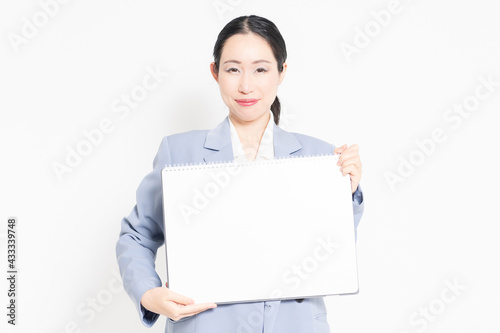 白バックの前に立って、大きいスケッチブックを持つ女性