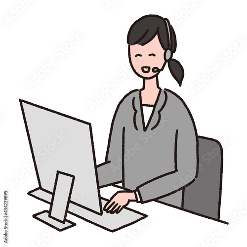 パソコン作業をしている笑顔のコールセンターのオペレーターの若い女性