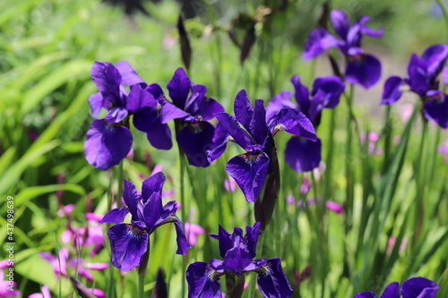 春の公園に咲く紫色のアヤメの花
