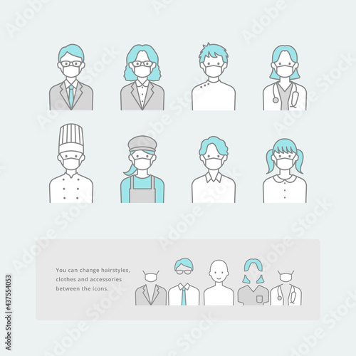 着せ替え可能な線画アイコンセット、マスクをした会社員・医療・飲食業の人物