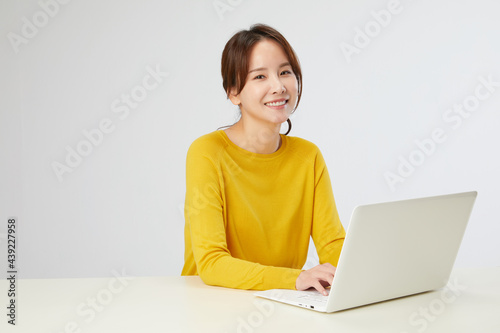 노트북, 여자, 흰색 테이블, 인물사진, 앉아있는, 노란색 니트, 미소, 학생