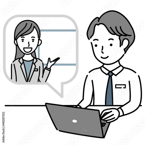 女性講師からオンラインで説明を受ける男性のイラスト素材