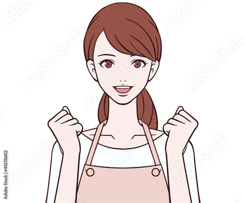 ガッツポーズをするエプロン姿の女性