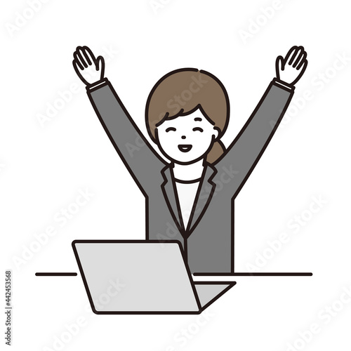 パソコンの前で万歳をするビジネスウーマン