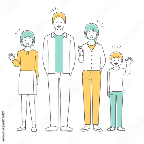 家族 笑顔で手を振る夫婦と子どもたち 全身