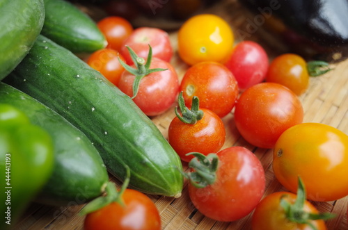 市場で夏の新鮮おいしい野菜を