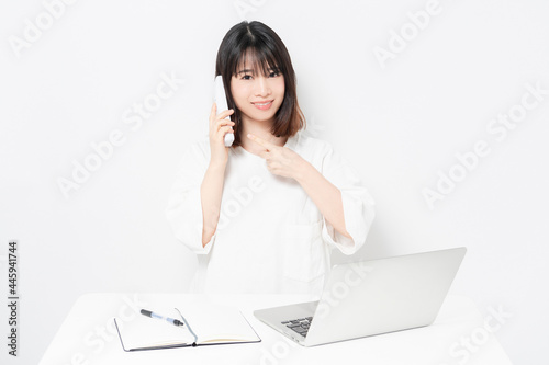 白背景の前でノートパソコンを使いながら、電話をかける、若い女性
