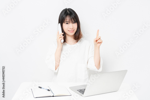 白背景の前でノートパソコンを使いながら、電話をかける、若い女性