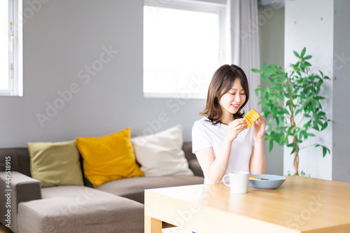 自宅で朝食を食べる若い女性