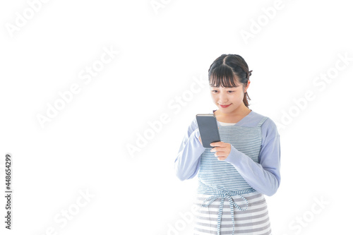 笑顔でスマートフォンを使う若い主婦