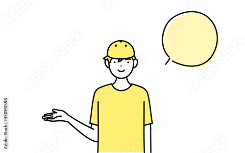 右手で案内をする男の子のスケーターの線画、吹き出しつき