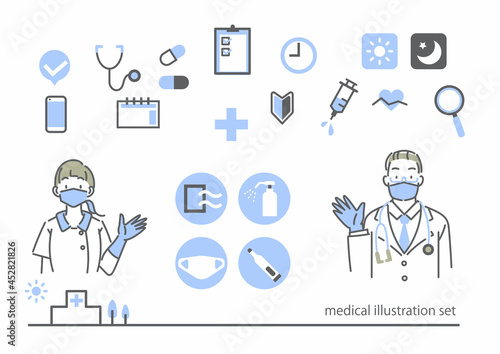 医療スタッフとメディカルアイコンセット シンプルでお洒落な線画イラスト