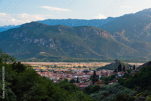 ギリシャ メテオラのアギア・トリアダ修道院までのトレッキングコースから見えるカランバカの街並みと後ろに広がるピンドス山脈