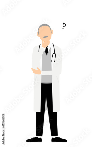 白衣のシニア男性医師が腕を組む・疑問を持つポーズ