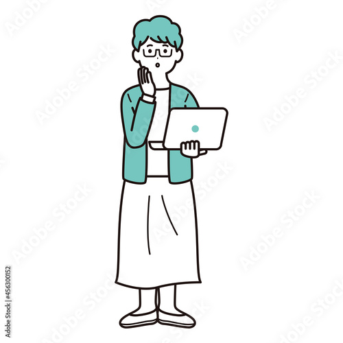 パソコンを手に持って考える人物のイラスト素材 中年の女性 私服 全身