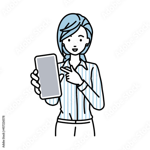 立ってスマートフォンを指差してこちらに向けて見せているブラウスの女性