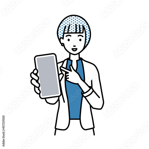 立ってスマートフォンを指差してこちらに向けて見せているジャケットの女性