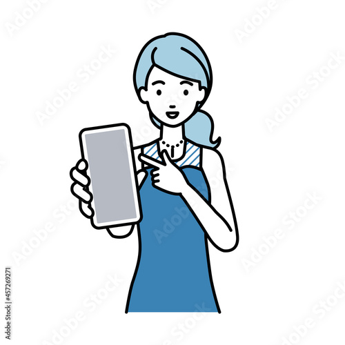 立ってスマートフォンを指差してこちらに向けて見せているドレスの女性