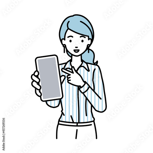 立ってスマートフォンを指差してこちらに向けて見せているブラウスの女性