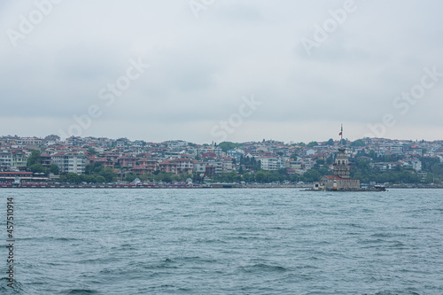 トルコ イスタンブールのボスポラス海峡に浮かぶ小島に建つ乙女の塔とユスキュダルの街並み
