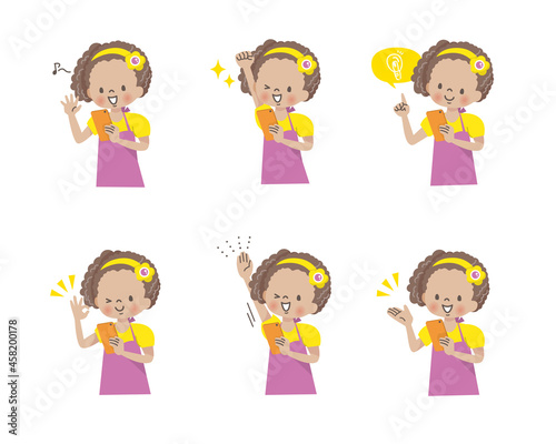スマホを操作する黒人の女の子,ポジティブな表情セット