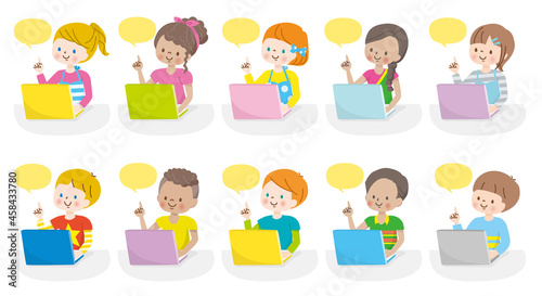 笑顔でパソコンを操作する世界各国の子供達のイラスト