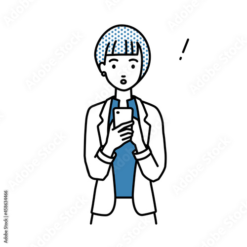 立ってスマートフォンを操作して何かに気づいて驚いたジャケットの女性